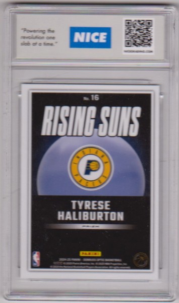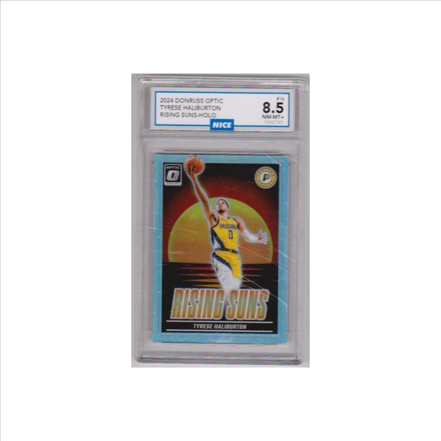 This is a Tyrese Haliburton 2024-25 Donruss Optic Rising Suns Holo #16 card that has been graded a NM-MT+ 8.5 by Nice Grading. The holder has heavy surface wear/scuffs, but the card inside is not affected at all. Overall, this is still a nice graded card of this NBA star.