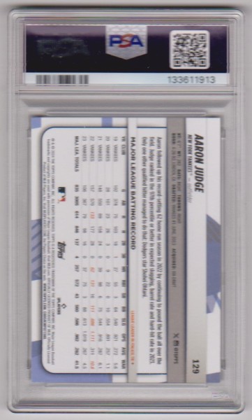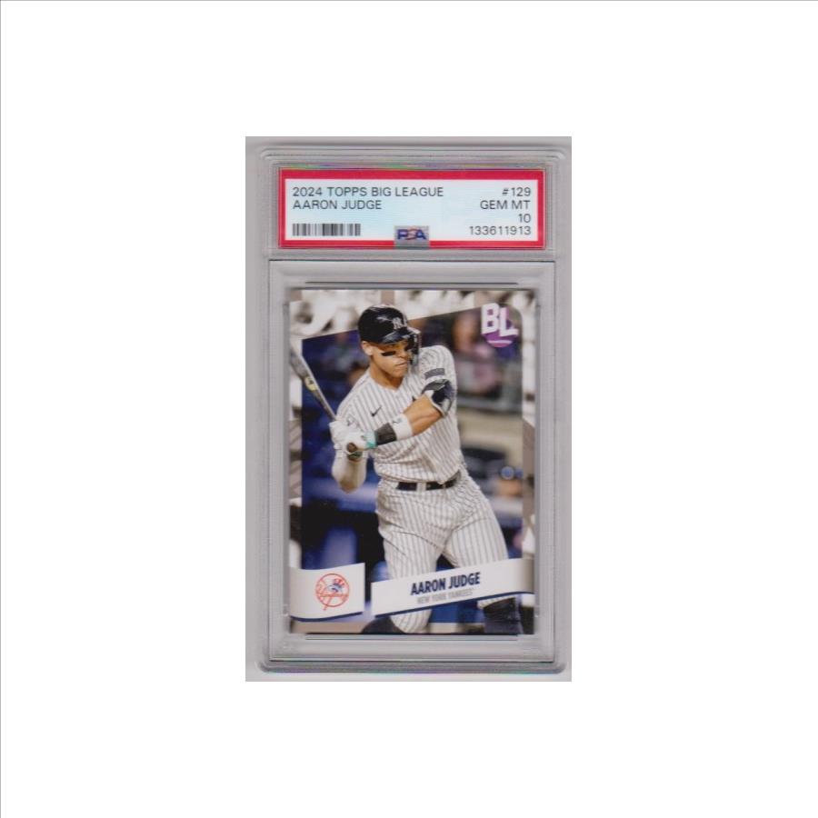 This is an Aaron Judge 2024 Topps Big League #129 card that has been graded a Gem Mint 10 by PSA. This is a sharp PSA graded card of this baseball star.
