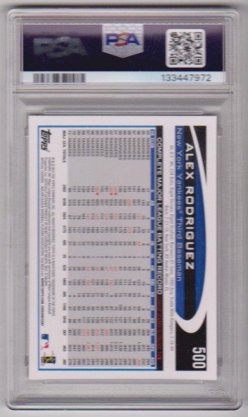 This is a Alex Rodriguez 2012 Topps #500 card that has been graded a Gem Mint 10 by PSA. The holder has some minor surface wear, but overall this is a sharp PSA graded card of this retired baseball star.