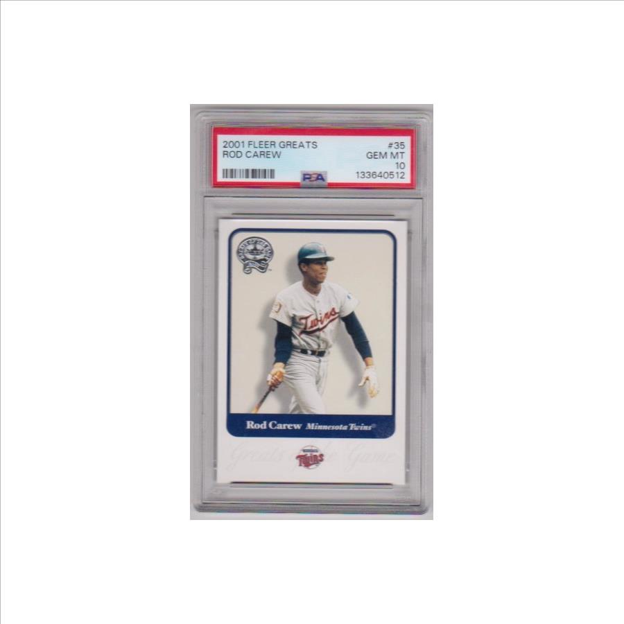 This is a Rod Carew 2001 Fleer Greats #35 card that has been graded a Gem Mint 10 by PSA. There are a couple of light surface scuffs on the holder, but overall this is a sharp PSA graded card of this Baseball Hall Of Famer.