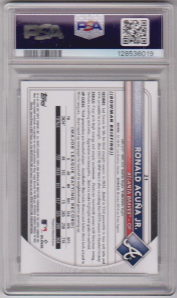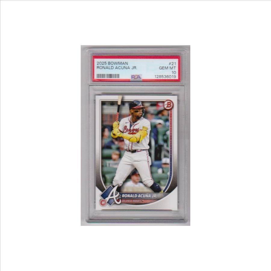 This is a Ronald Acuna Jr. 2025 Bowman #21 card that has been graded PSA Gem Mint 10. The holder has some very minor surface wear, but overall this is a sharp PSA graded card of this baseball star.