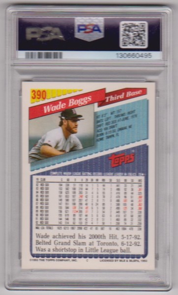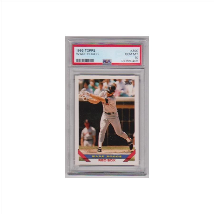 This is a Wade Boggs 1993 Topps #390 card that has been graded a Gem Mint 10 by PSA. The holder has some light surface wear, but overall this is a sharp PSA graded card of this Baseball Hall Of Famer.