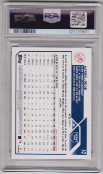 PropertyRoom.com's trusted merchant, Sports Collectibles, presents this online auction for the above Graded PSA Mint 9 - Aaron Judge 2023 Topps #62 Card.