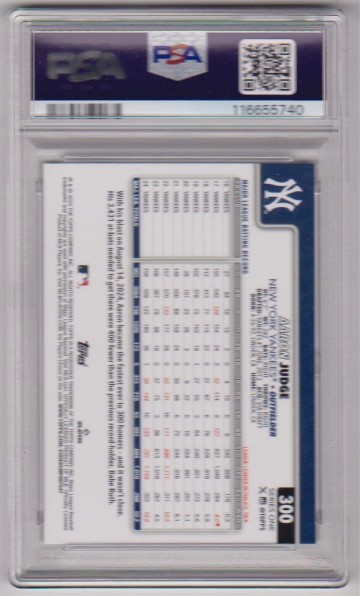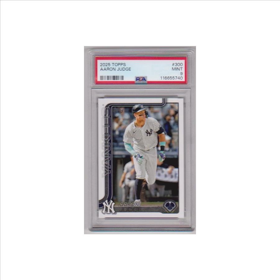 This is a Aaron Judge 2025 Topps #300 card that has been graded Mint 9 by PSA. This is a sharp graded card of this baseball star.