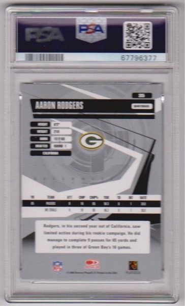 This is a 2006 Donruss Elite Aaron Rodgers #35 card that has been graded a Mint 9 by PSA.  The holder has some light surface wear/scuffs, but overall this is a nice PSA graded card of this NFL star.