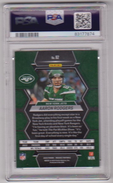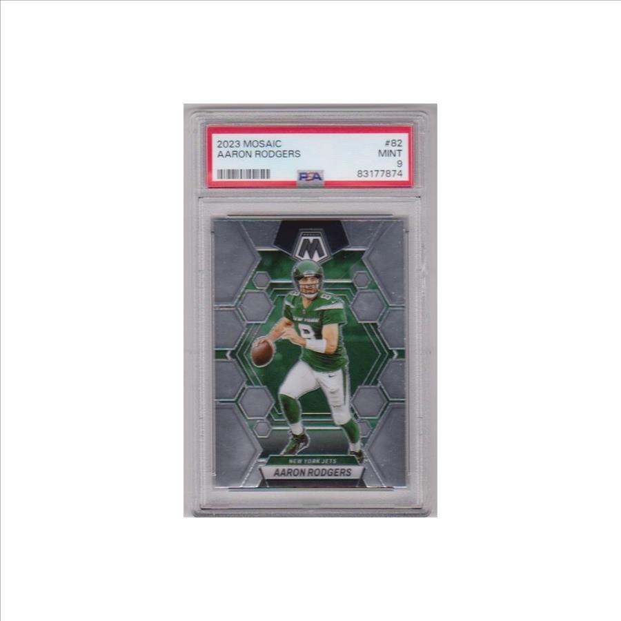This is a Aaron Rodgers 2023 Panini Mosaic #82 card that has been graded a Mint 9 by PSA.  The holder has some light surface wear, but overall this is a sharp PSA graded card of this NFL star.