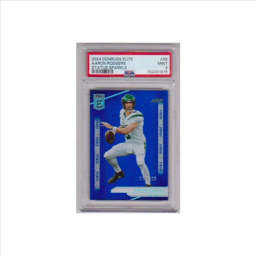 This is a Aaron Rodgers 2024 Donruss Elite Status Sparkle #99 Insert card that has been graded PSA Mint 9. Only 299 of this card was produced and this one is #99/299.  The holder has some very light surface wear, but this is a nice PSA graded card of this NFL star.