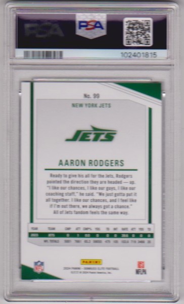 PropertyRoom.com's trusted merchant, Sports Collectibles, presents this online auction for the above Graded PSA Mint 9 - Aaron Rodgers 2024 Donruss Elite Status Sparkle #99 Insert Card (#ed/299!).