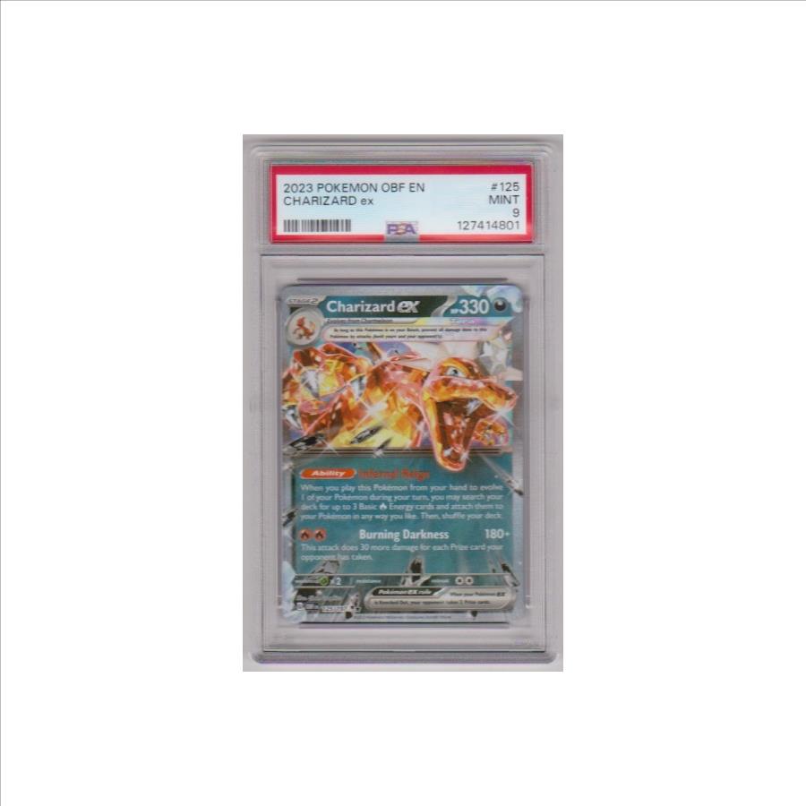 This is a Charizard EX 2023 Pokemon Obsidian Flames EN #125/197 card that has been graded a Mint 9 by PSA.  The holder has some minor surface wear but overall this is a sharp PSA graded Charizard card.