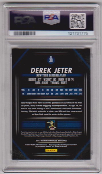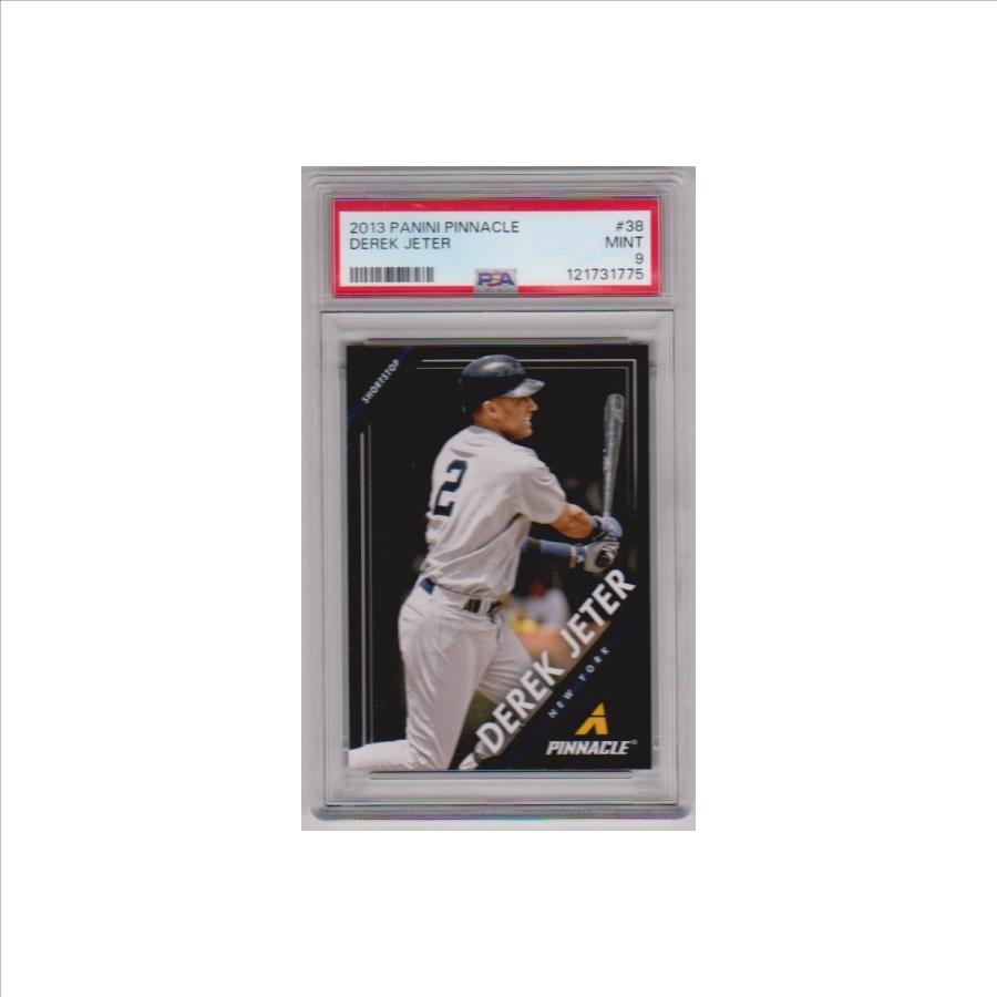 This is a 2013 Panini Pinnacle Derek Jeter #38 card that has been graded a Mint 9 by PSA.  The holder has some very minor surface wear, but overall this a sharp PSA graded card of this baseball Hall Of Famer.