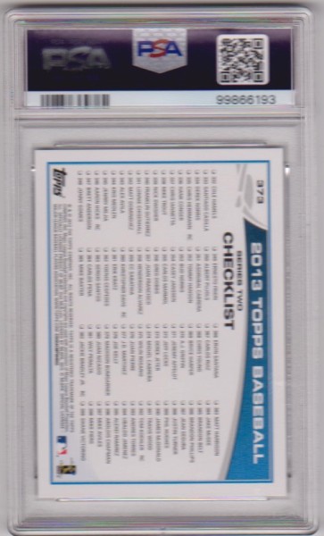 This is a Derek Jeter 2013 Topps Checklist #373 card that has been graded a Mint 9 by PSA.  This a sharp PSA graded card of this baseball Hall Of Famer.