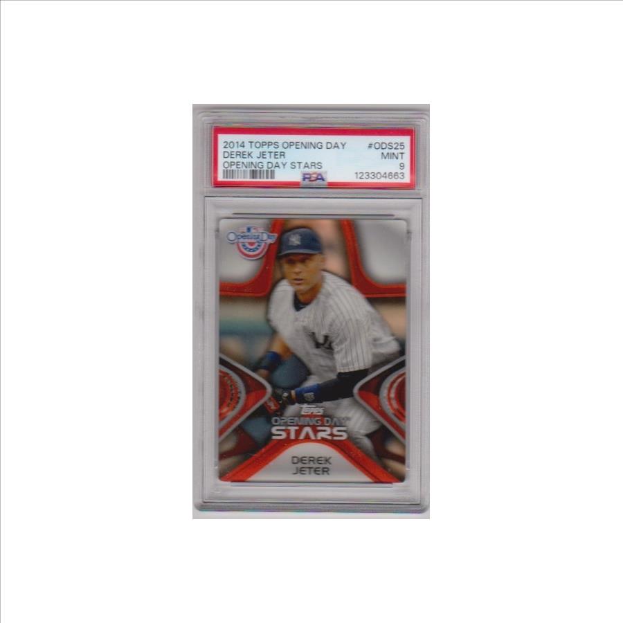 This is a Derek Jeter 2014 Topps Opening Day Opening Day Stars #ODS-25 Insert card that has been graded a Mint 9 by PSA.  The holder has minor surface wear, but overall this is a sharp PSA graded card of this baseball Hall of Famer.