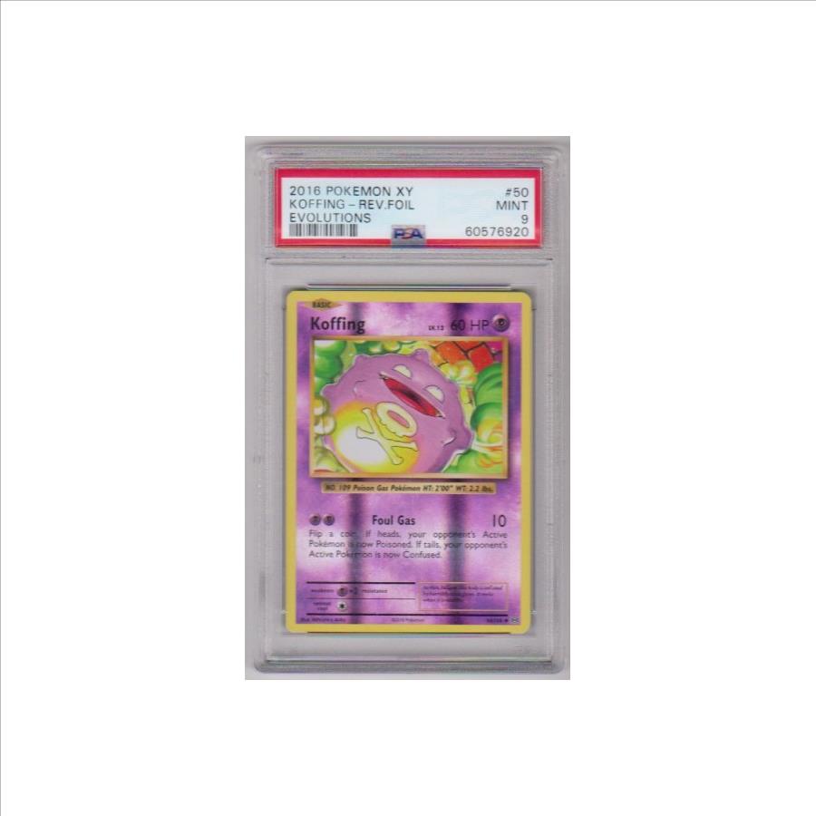 This is a Koffing 2016 Pokemon XY Evolutions REVERSE HOLO #50 card that has been graded PSA Mint 9. The holder has some light surface wear, but overall this is a sharp PSA graded Pokemon card.