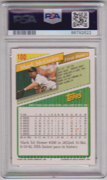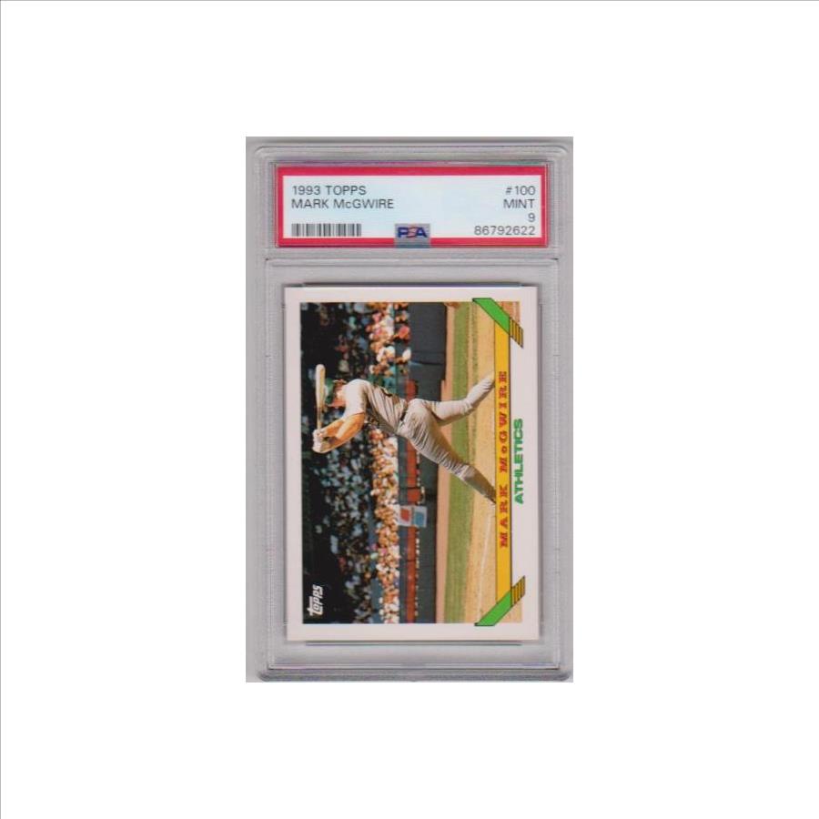 This is a  Mark McGwire 1993 Topps #100 card that has been graded a Mint 9 by PSA. This is a sharp PSA graded card of this retired baseball star.