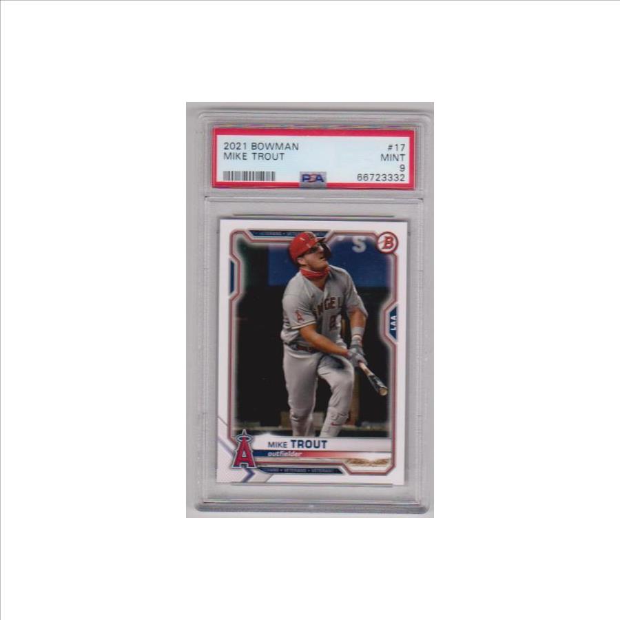 This is a Mike Trout 2021 Bowman #17 card that has been graded a Mint 9 by PSA. The holder has some minor surface wear, but overall this is a sharp PSA graded card of this baseball star.