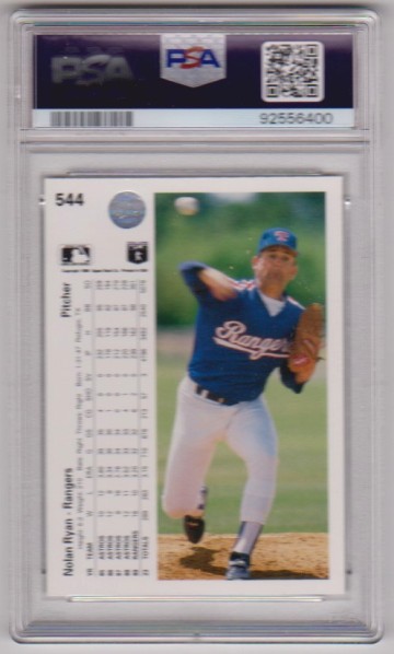 This is a Nolan Ryan 1990 Upper Deck #544 card that has been graded Mint 9 by PSA. The holder has some very minor surface wear, but overall this is a sharp graded card of this baseball Hall Of Famer.