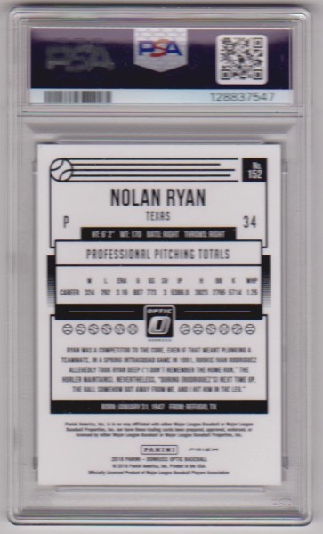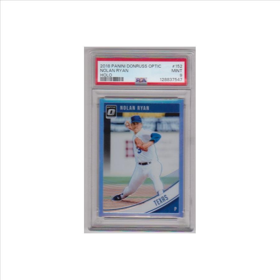 This is a Nolan Ryan 2018 Donruss Optic Holo #152 card that has been graded a Mint 9 by PSA.  This is a sharp PSA graded card of this baseball Hall of Famer.