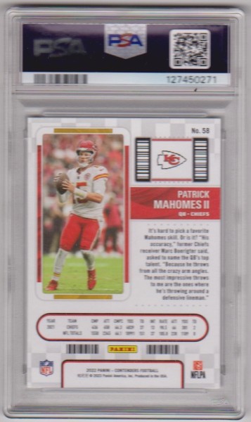 This is a Patrick Mahomes 2022 Panini Contenders #58 card that has been graded a Mint 9 by PSA.  This is a sharp PSA graded card of this NFL star.