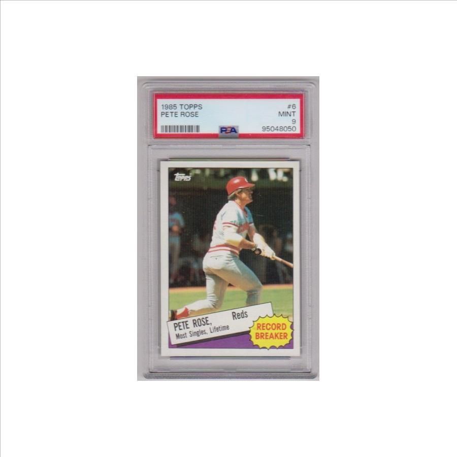 PropertyRoom.com's trusted merchant, Sports Collectibles, presents this online auction for the above Graded PSA Mint 9 - Pete Rose 1985 Topps #6 Card.