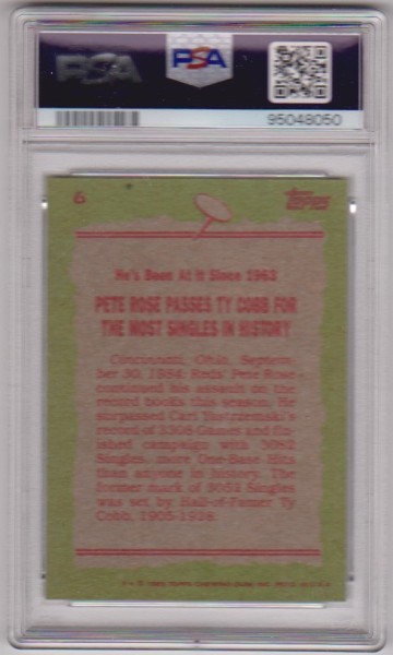 This is a Pete Rose 1985 Topps #6 card that has been graded a Mint 9 by PSA.  The holder has some light surface wear, but overall this is a sharp PSA graded card of this future Baseball Hall of Famer.