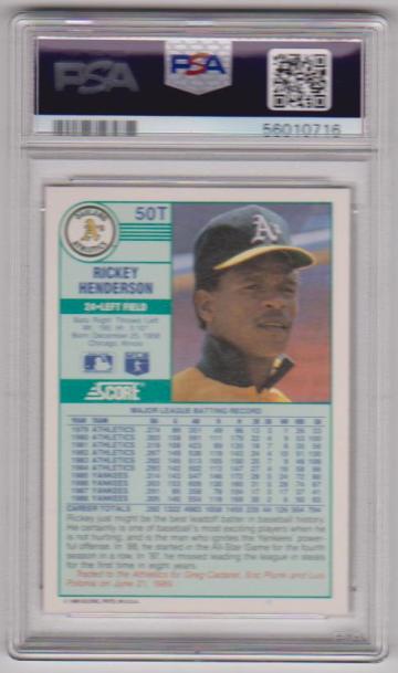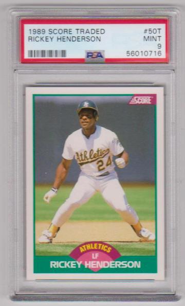 This is a Rickey Henderson 1989 Score Traded #50T card that has been graded PSA Mint 9. This is a sharp PSA graded card of this baseball Hall of Famer.