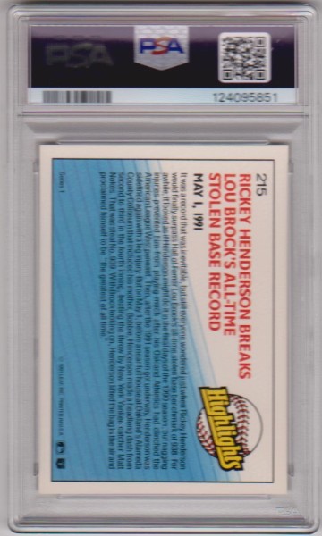 This is a Rickey Henderson 1992 Donruss Highlights #215 card that has been graded PSA Mint 9. This is a sharp PSA graded card of this baseball Hall of Famer.