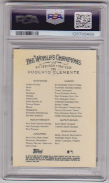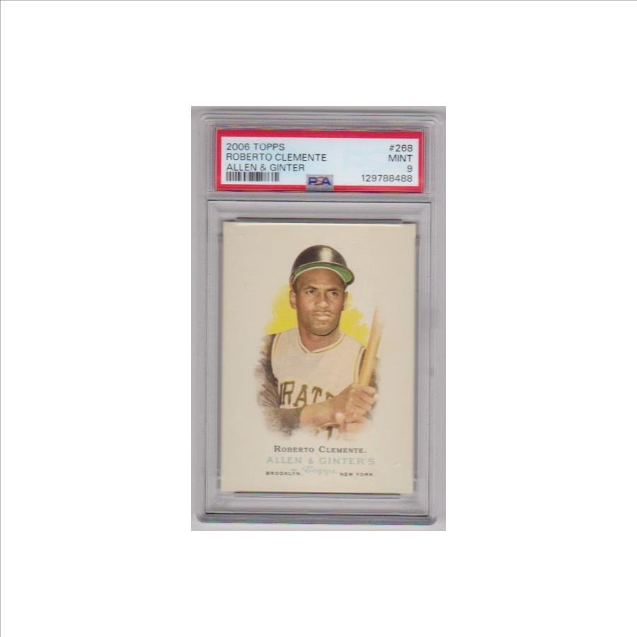 This is a Roberto Clemente 2006 Topps Allen & Ginter #268 card that has been graded a Mint 9 by PSA.  The holder has some light surface wear, but overall this is a sharp PSA graded card of this baseball Hall of Famer.