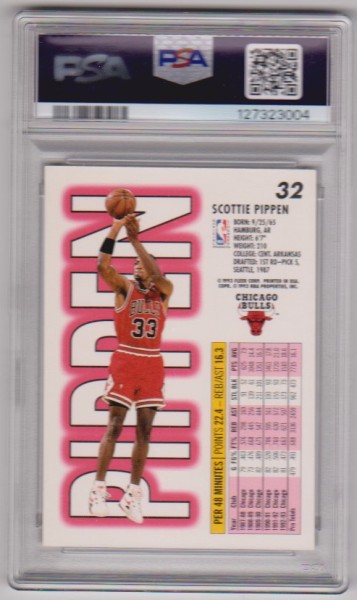 This is a Scottie Pippen 1993-94 Fleer #32 card that has been graded a Mint 9 by PSA.  The holder has some light surface wear, but overall this is a sharp PSA graded card of this NBA Hall of Famer.