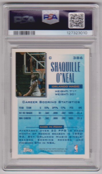 This is a Shaquille O'Neal 1993-94 Topps #386 card that has been graded a Mint 9 by PSA.  The holder has some minor surface wear, but overall this is a sharp PSA graded card of this NBA Hall of Famer.