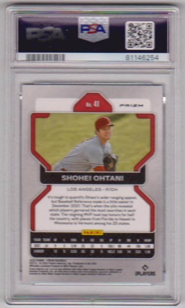 This is a Shohei Ohtani 2022 Panini Prizm Blue Prizm #41 Parallel card that has been graded a Mint 9 by PSA. The holder has some minor touches of surface wear, but overall this is a sharp PSA graded card of this baseball star.