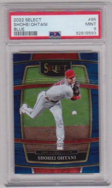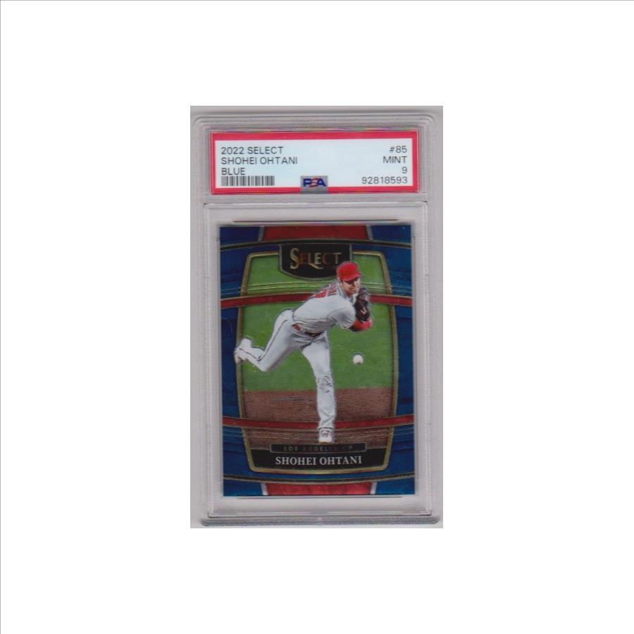 This is a Shohei Ohtani 2022 Panini Select Blue Concourse #85 card that has been graded a Mint 9 by PSA. The holder has some very minor surface wear, but overall this is a sharp PSA graded card of this baseball star.