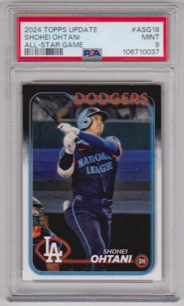 This is a Shohei Ohtani 2024 Topps Update  All-Star Game #ASG-18 card that has been graded PSA Mint 9. The holder has some minor surface wear, but overall this is a sharp PSA graded card of this baseball star.