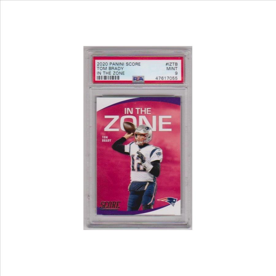 This is a Tom Brady 2020 Score In The Zone #IZ-TB Insert card that has been graded Mint 9 by PSA. The holder has some very minor surface wear, but overall this is a sharp PSA graded card of this retired NFL star.