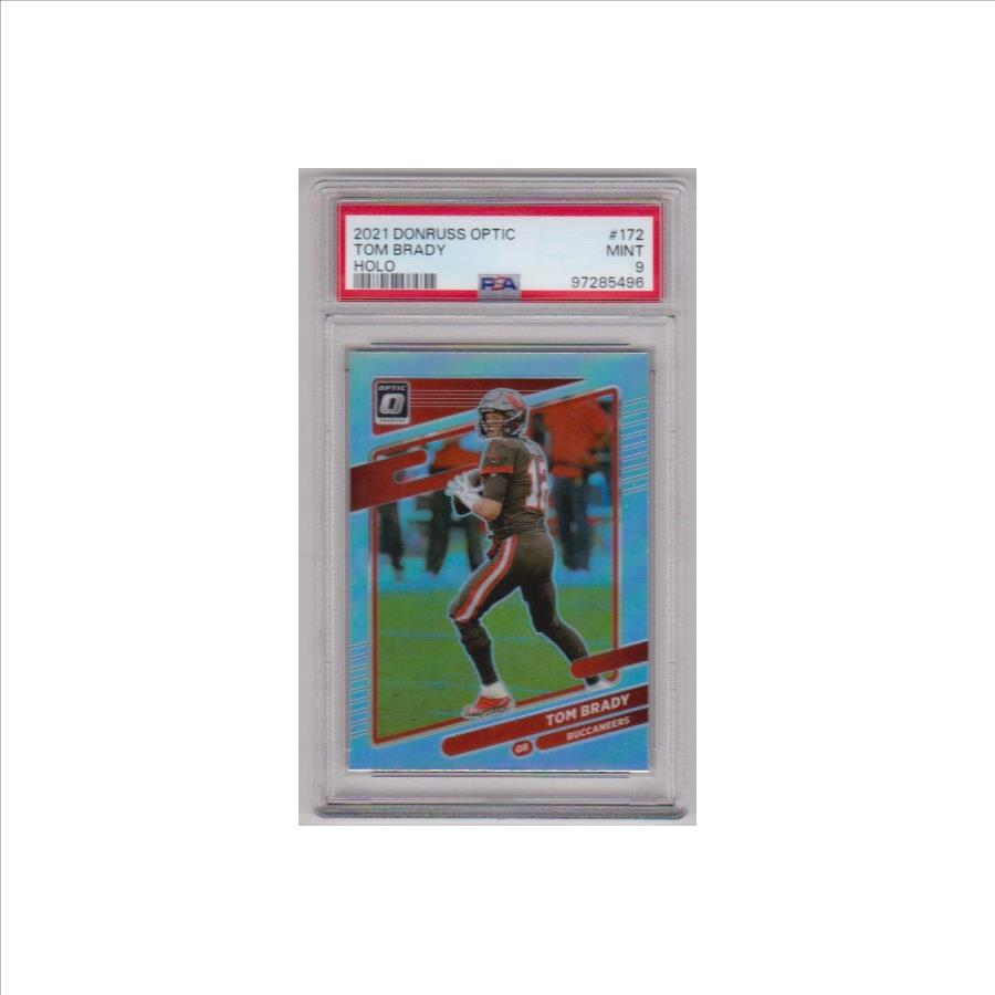 PropertyRoom.com's trusted merchant, Sports Collectibles, presents this online auction for the above Graded PSA Mint 9 - Tom Brady 2021 Donruss Optic Holo #172 Parallel Card.