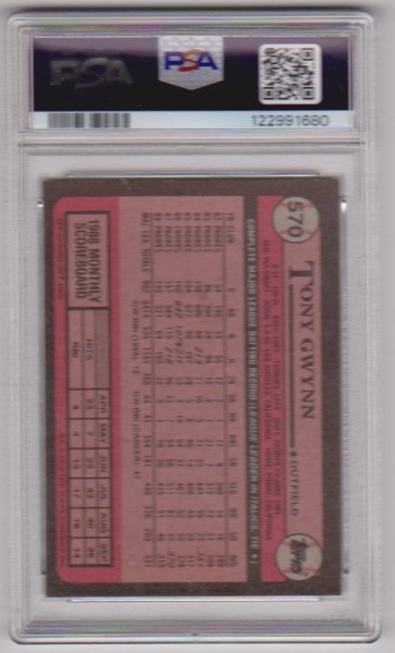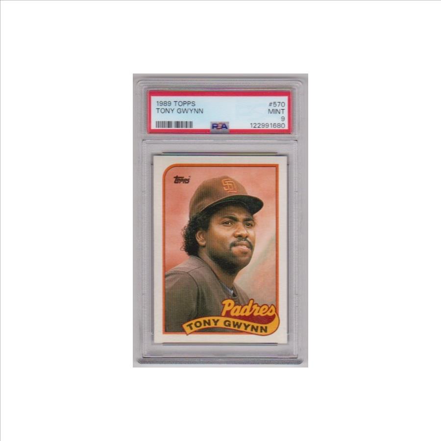 This is a Tony Gwynn 1989 Topps #570 card that has been graded a Mint 9 by PSA.  This a sharp PSA graded card of this baseball Hall Of Famer.
