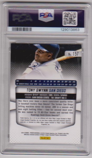 This is a Tony Gwynn 2014 Panini Prizm #157 card that has been graded a Mint 9 by PSA.  The holder has some minor surface wear, but overall this a sharp PSA graded card of this baseball Hall Of Famer.