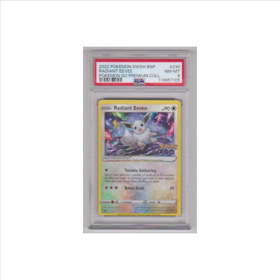 This is a Radiant Eevee 2022 Pokemon Sword & Shield Black Star Promo #SWSH230 card that has been graded a NM-MT 8 by PSA.  The holder has some light surface wear, but overall is a sharp graded Radiant Eevee card.