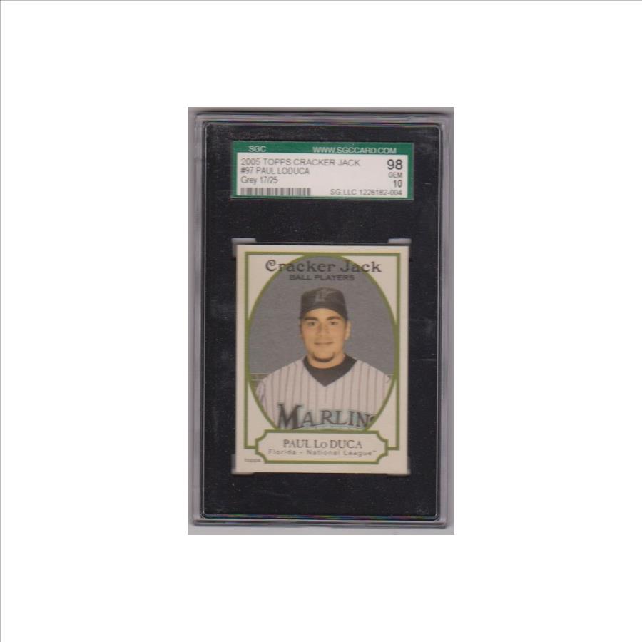 This is a Paul Lo Duca 2005 Topps Cracker Jack #97 Grey card that has been graded a Gem Mint 10 by SGC. Only 25 of this card was produced and this one is #17/25. The holder has wear/scuffs, but overall this is a nice graded card of this retired baseball star.