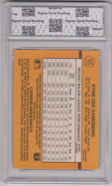 This is a Ryne Sandberg 1989 Donruss #105 card that has been graded a Gem Mint 10 by Sigma Grading.  The holder has some very minor surface wear, but overall this is a sharp graded card of this Baseball Hall of Famer.