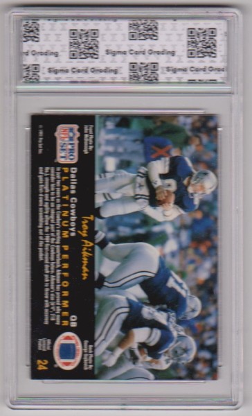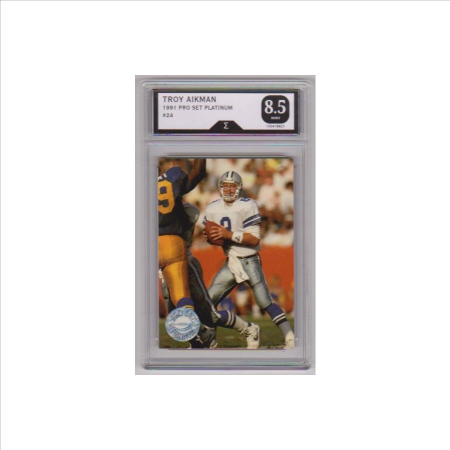 This is a Troy Aikman 1991 Pro Set Platinum #24 card that has been graded a Mint 8.5 by Sigma Grading.  The holder has some surface wear/scuffs, but overall this is a nice graded card of this NFL Hall of Famer.