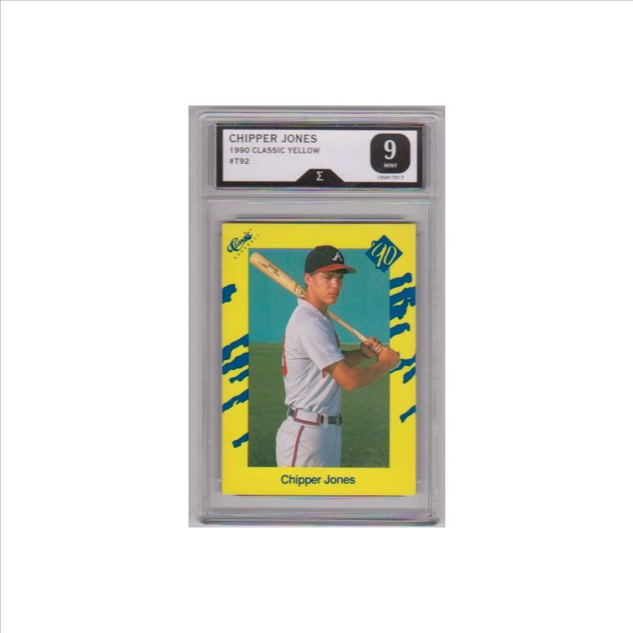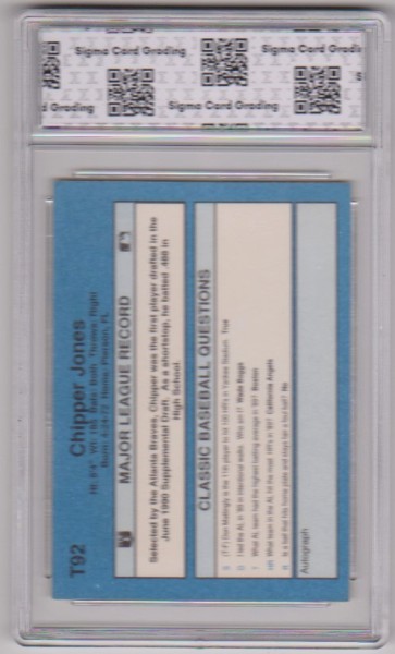 This is a Chipper Jones 1990 Classic #T92 Rookie Card that has been graded a Mint 9 by Sigma Grading.  The holder has light surface wear, but overall this is a sharp graded rookie card of this baseball Hall of Famer.