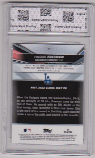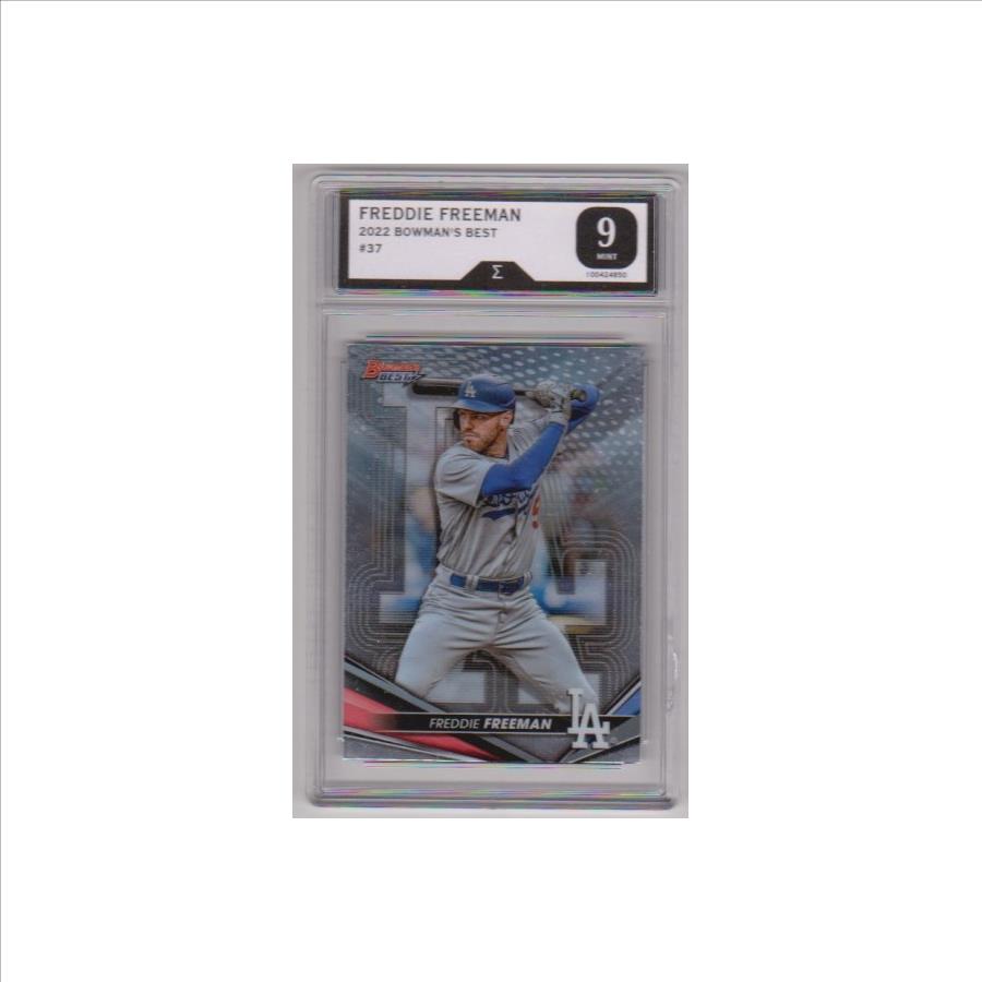 This is a Freddie Freeman 2022 Bowman's Best #37 card that has been graded Mint 9 by Sigma Grading. The holder has some light surface wear, but overall this is a sharp graded card of this baseball star.