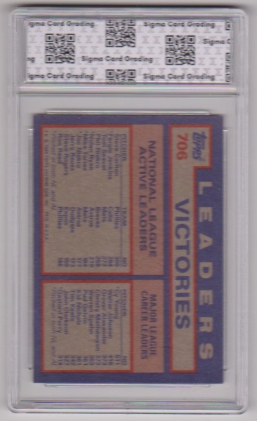 This is a Steve Carlton/Fergie Jenkins/Tom Seaver 1984 Topps #706 card that has been graded a Mint 9 by Sigma Grading.  The holder has some very minor surface wear, but overall this is a sharp graded card of these three baseball Hall of Famers.
