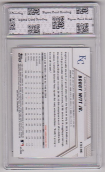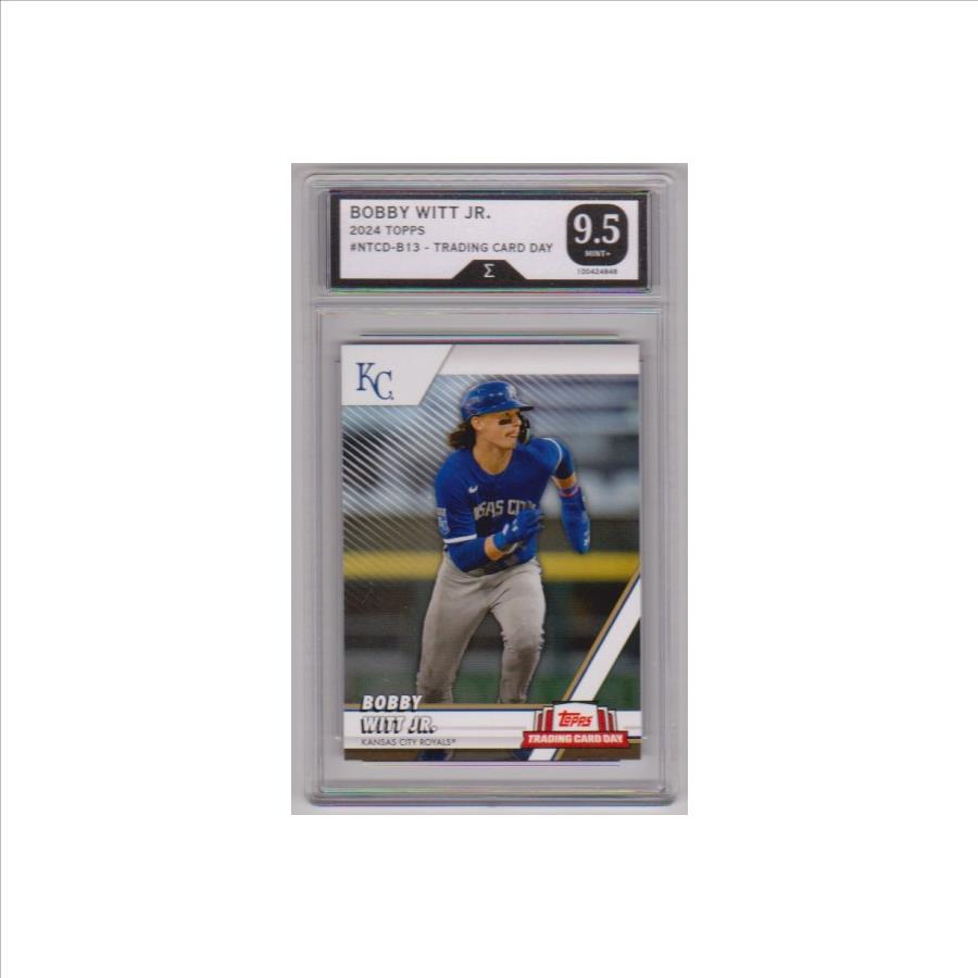 This is a Bobby Witt Jr. 2024 Topps Trading Card Day #NTCD-B13 card that has been graded a Mint+ 9.5 by Sigma Grading.  The holder has some minor surface wear, but overall this is a sharp graded card of this baseball star.