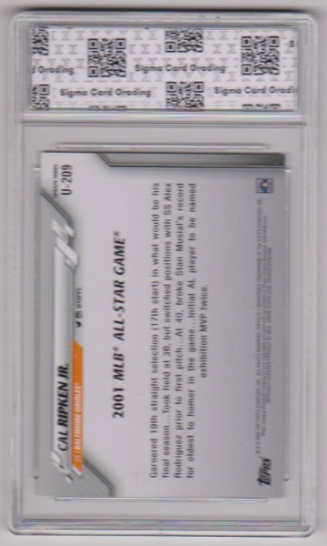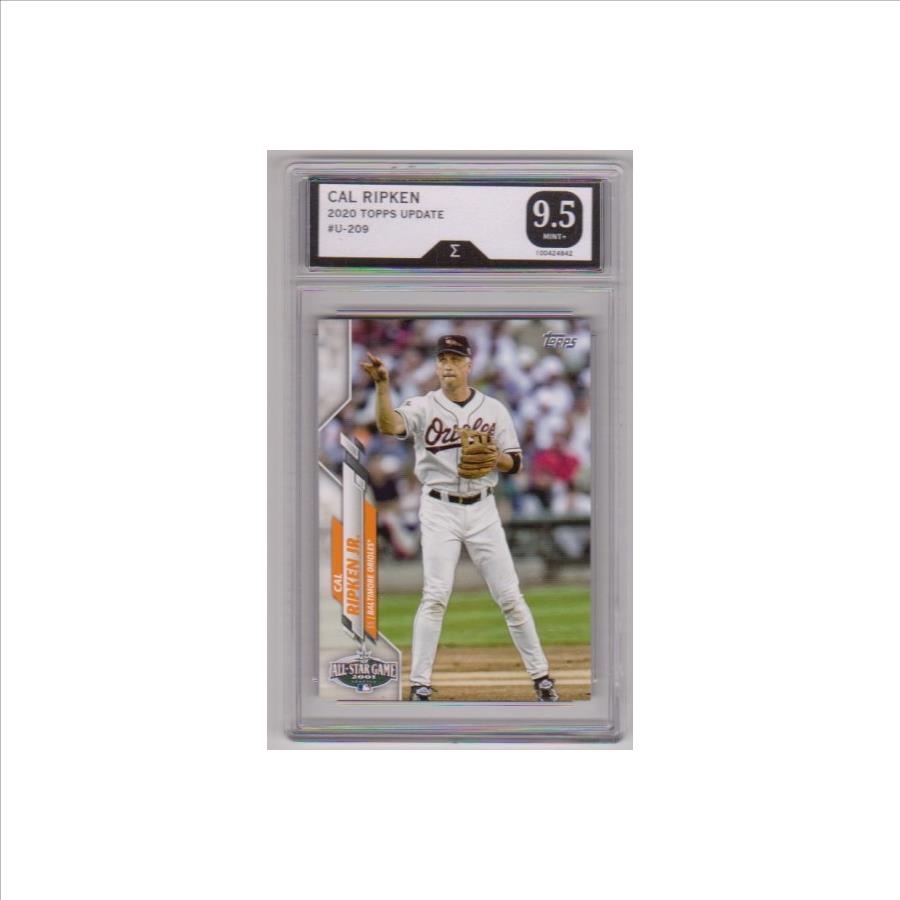 This is a Cal Ripken Jr. 2020 Topps Update #U-209 card that has been graded a Mint+ 9.5 by Sigma Grading.  The holder has some surface wear, but overall this is a sharp graded card of this baseball Hall Of Famer.