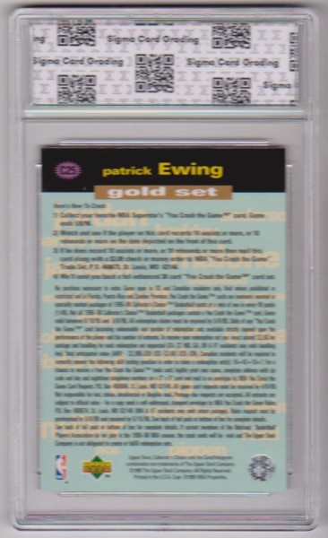 This is a Patrick Ewing 1995-96 Collector's Choice Crash The Game Gold #C25 insert card that has been graded a Mint+ 9.5 by Sigma. The holder has some light surface wear, but overall this is a nice looking graded card of this NBA Hall Of Famer.