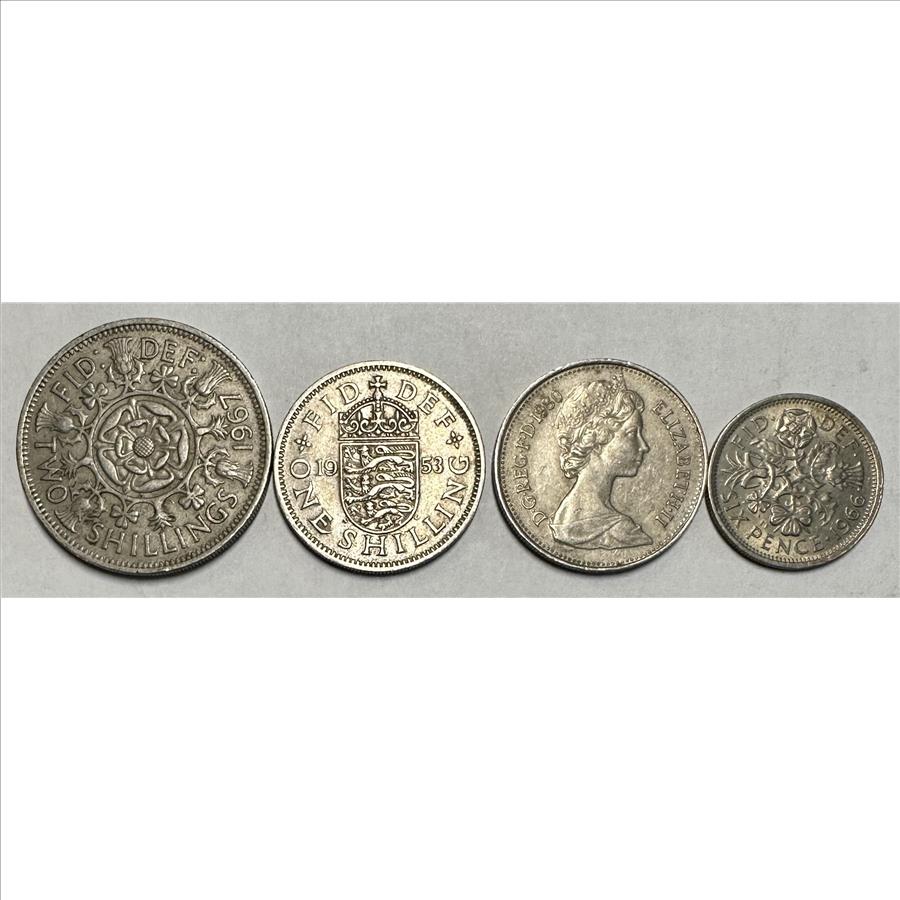 Great Britain Coins - 1967 Two Shillings, 1953 One Shilling, 1980 New Pence and 1966 Six Pence - Nice Set of 4 Coins