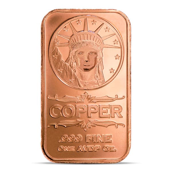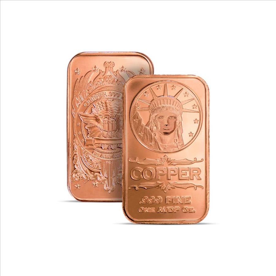 Bar Highlights Purity: 99.9% copper (minimum) Weight: 1 standard (avoirdupois) ounce Size: 1.85 x 1.08 x 0.11 thick Design Details Obverse: A detailed engraving of the Liberty Head of the Statue of Liberty, framed by 13 stars and inscriptions indicating purity and weight - "Copper," ".999 Fine," "One AVDP Oz."