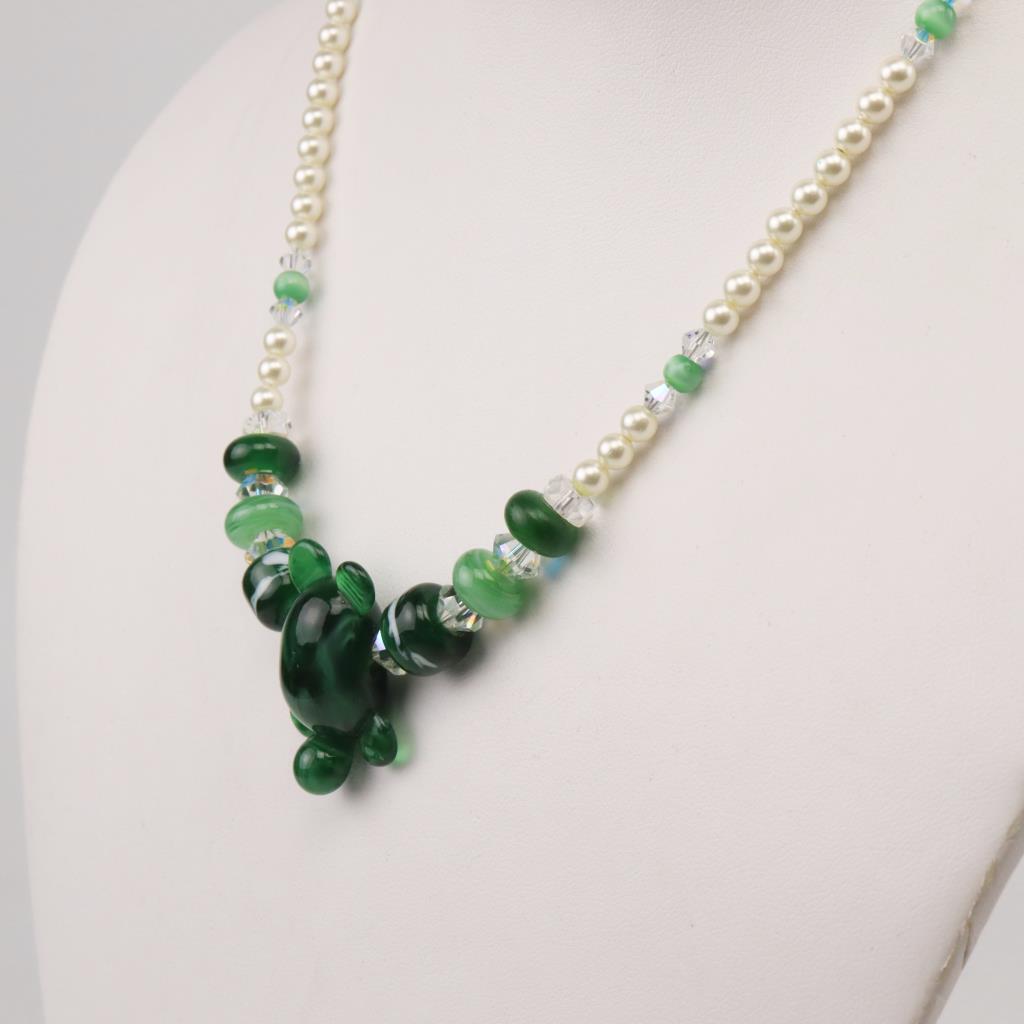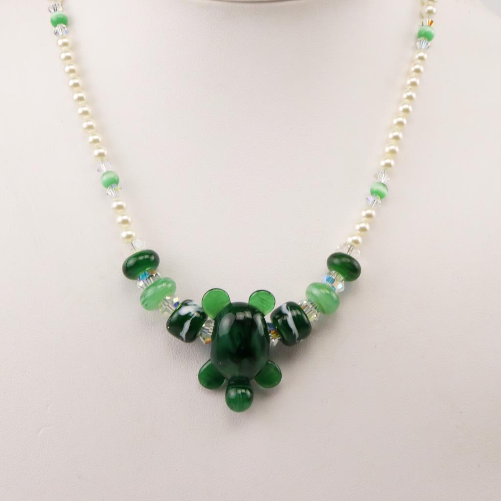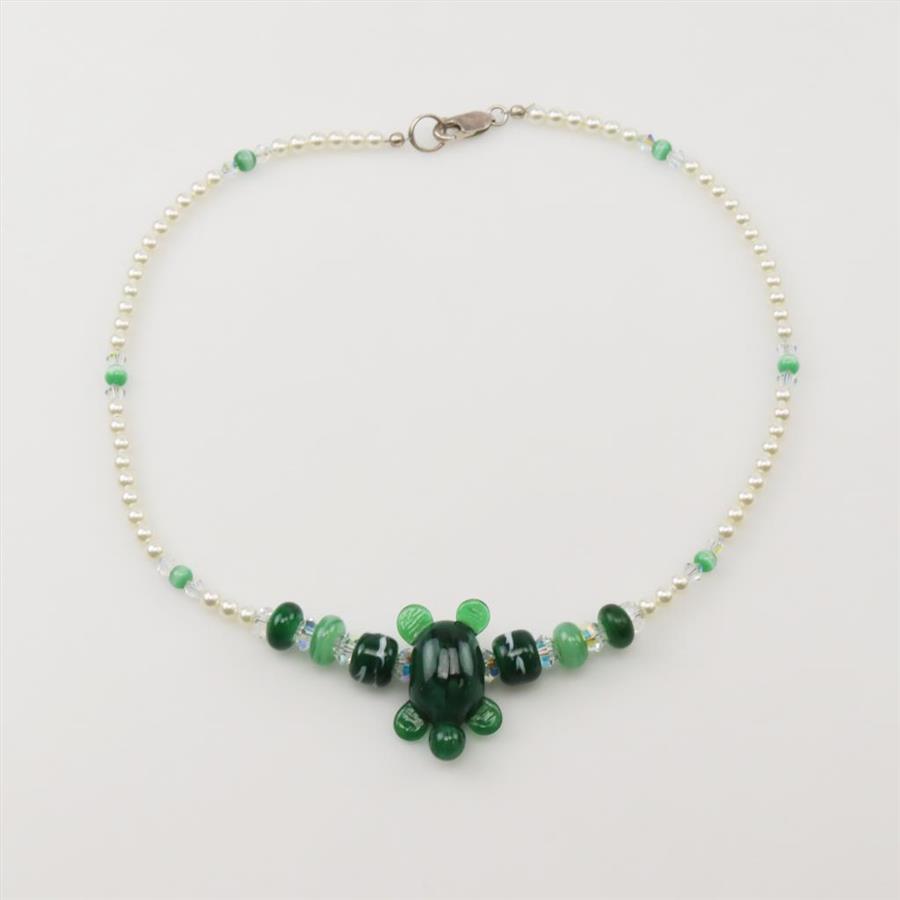 Green Beaded Turtle Silver Clasp Necklace