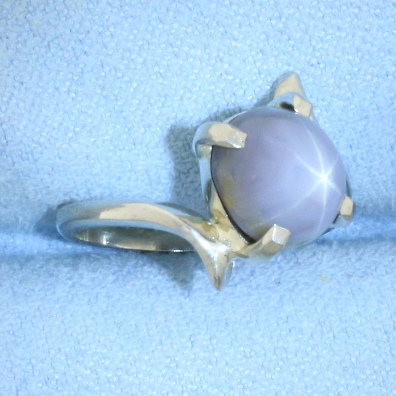 In 14k White Gold. Contains one high quality natural 8.5mmx7.5mm Star Sapphire gemstone with very distinct star under light. 14mm wide at widest. Size 4. 3.3g.